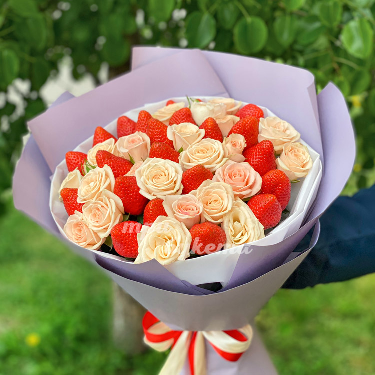 Белые розы и клубника в крафте