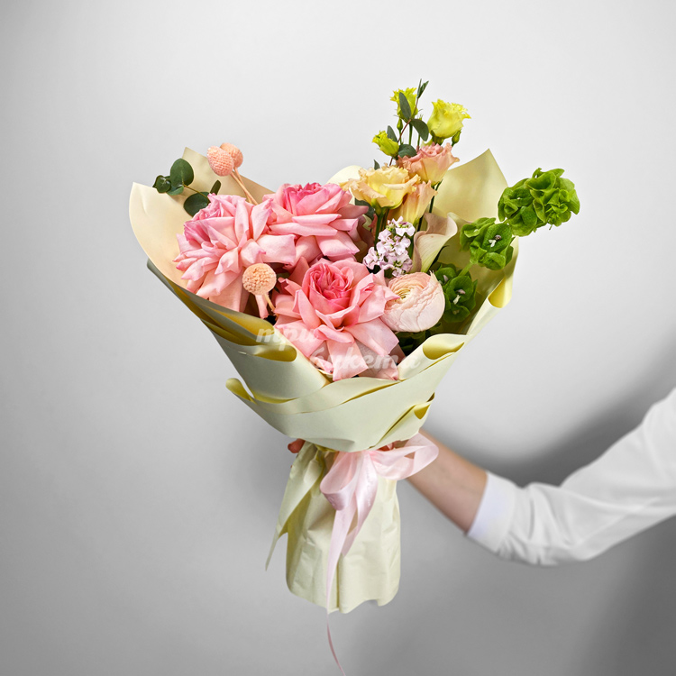 Букет французских роз, эустом и молуцеллы
