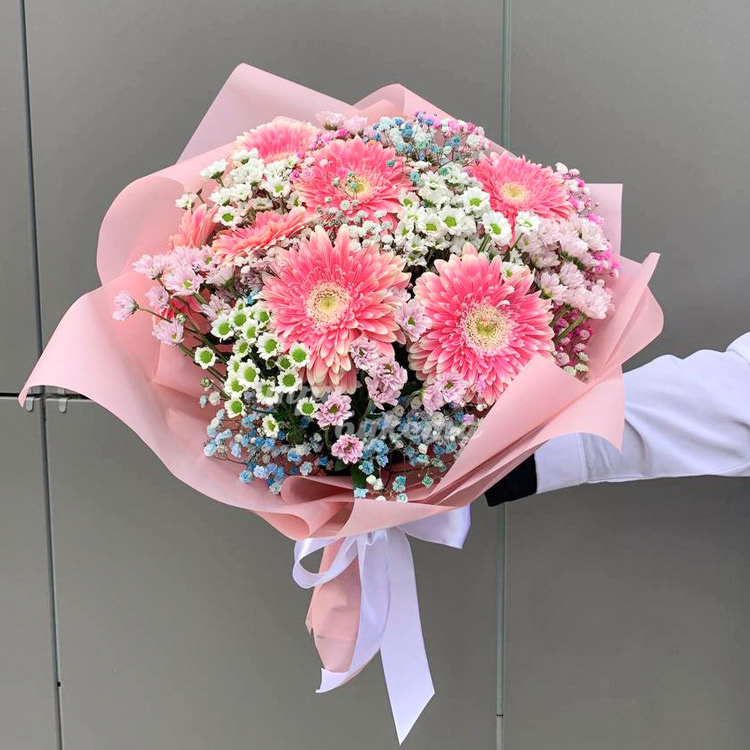 Букет гербер, хризантем и гипсофилы
