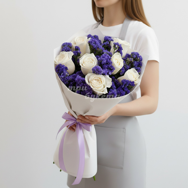 Букет из роз и синей статицы