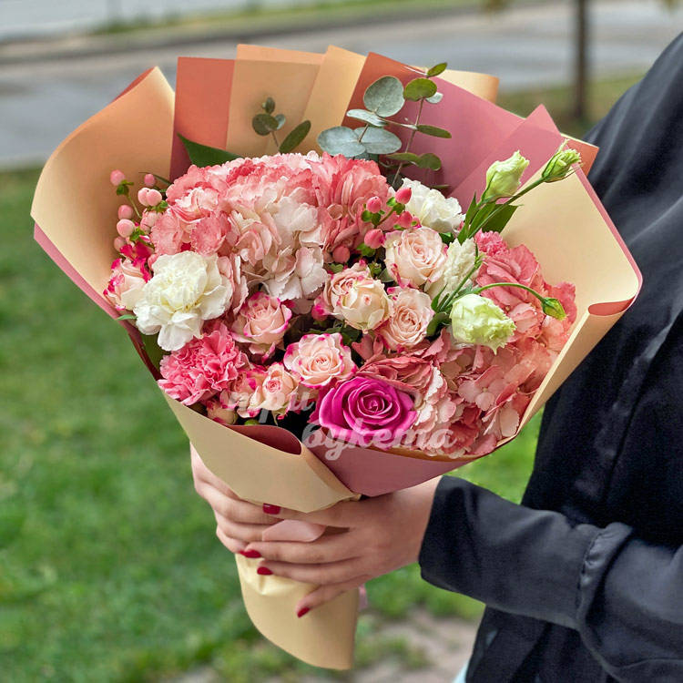 Букет персиковых гортензий и роз
