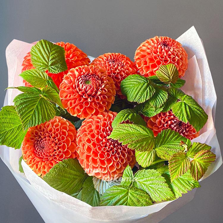 Букет ярких георгинов с малиной