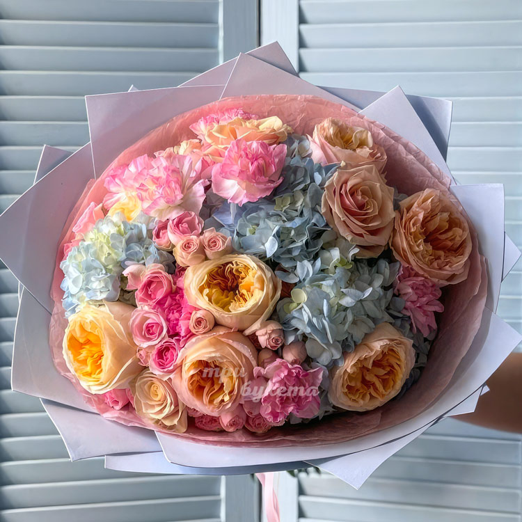 Букет ярких роз, гвоздик и гортензий