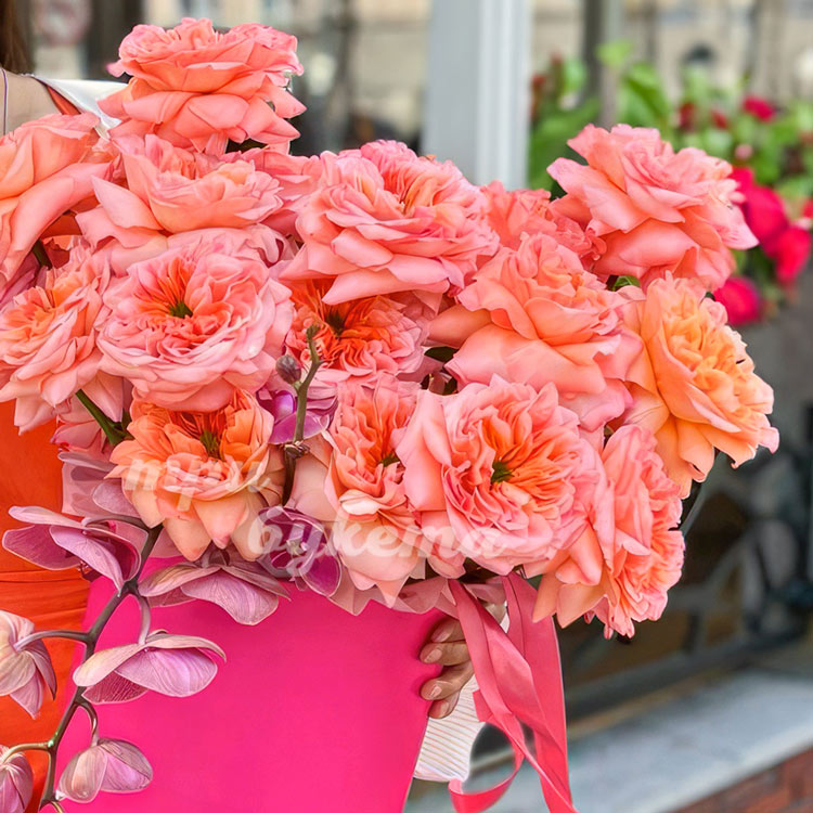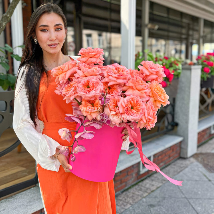 Коробка коралловых роз с орхидеями