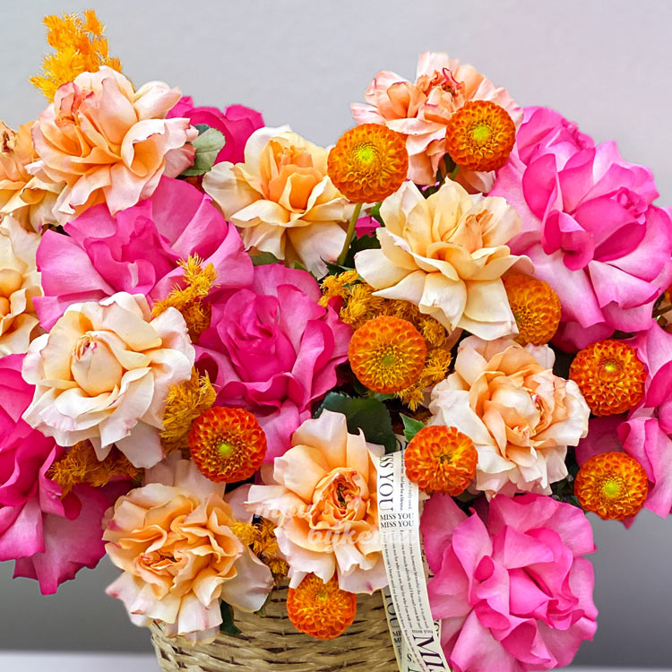 Корзина роз с хризантемами и аспарагусом