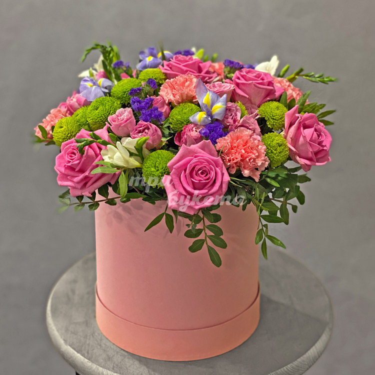 Розовая роза и гвоздики в коробке