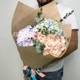 Розовый букет из хризантем и гортензии