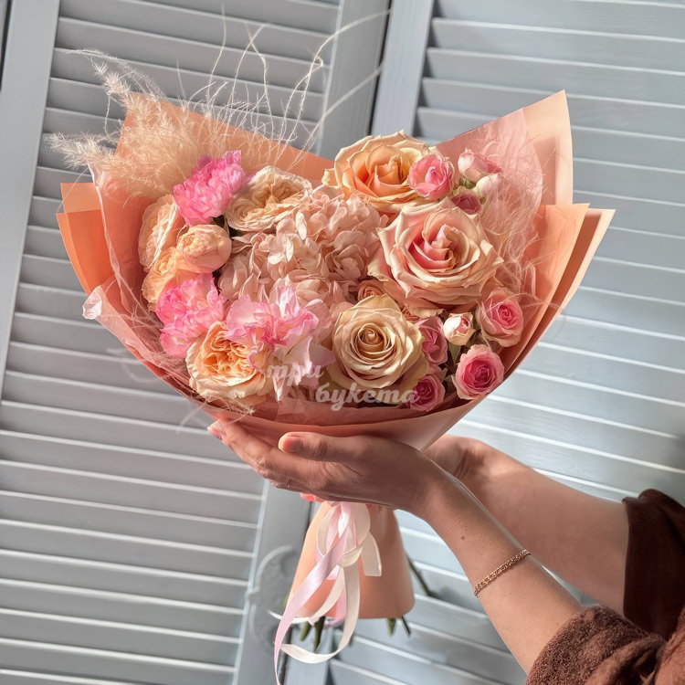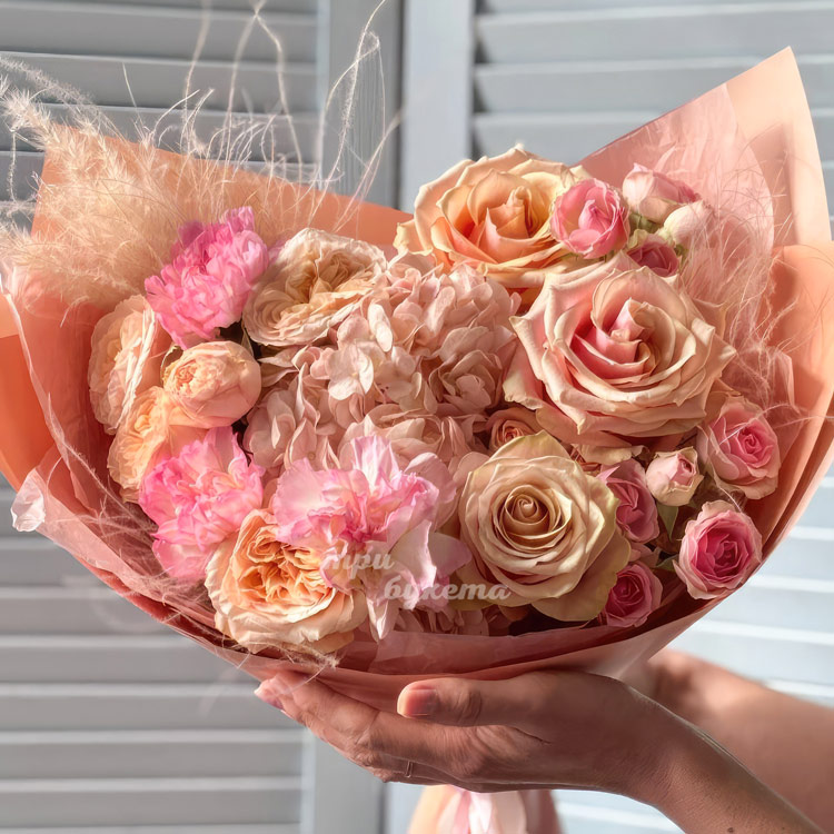 Сборный букет кремовых гортензий и роз