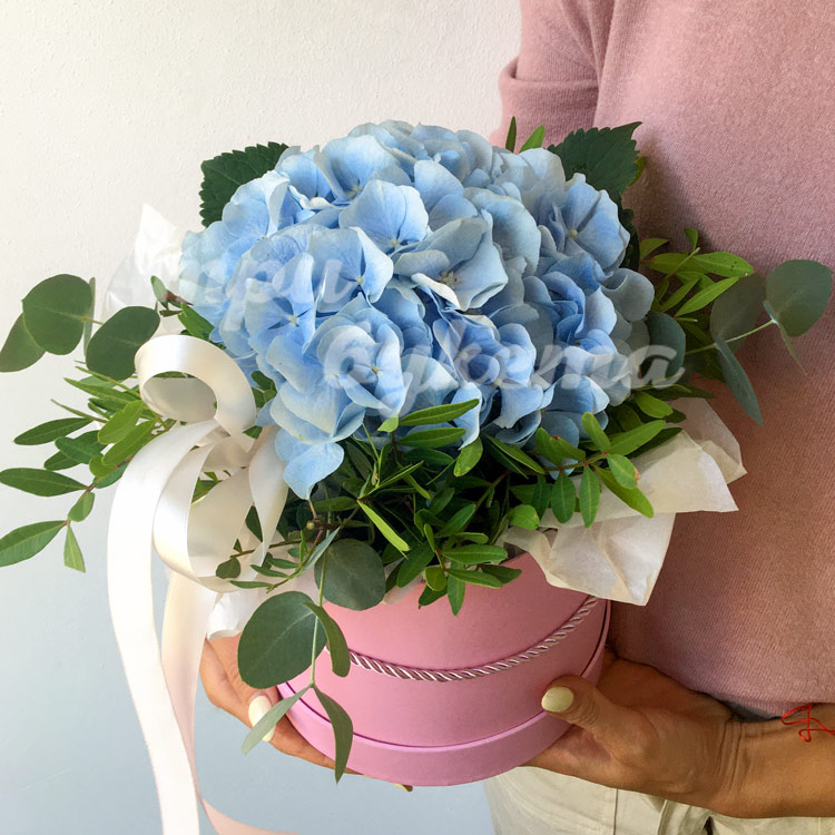 Синяя гортензия в шляпной коробке
